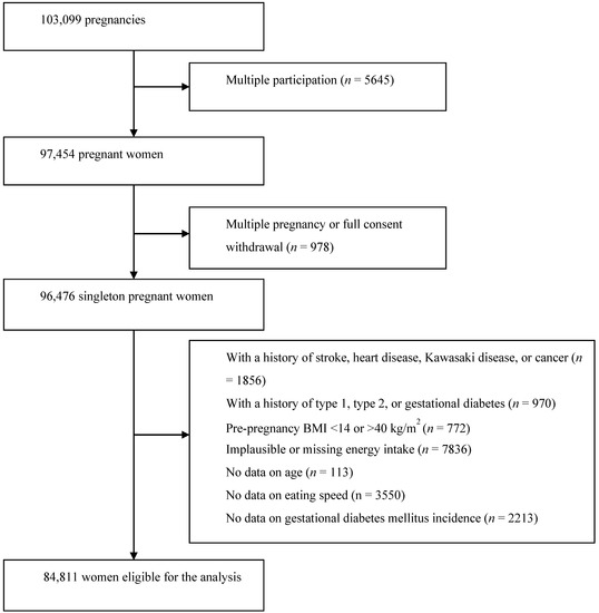 There were 103,099 pregnancies from 97,454 women recruited. Women were recruited voluntarily at the first prenatal examination and/or when they reported their pregnancies at local government offices. In 2013, the recruitment covered about 45% of pregnancies in the study area [19]. Among the 97,454 women, those who had singleton pregnancy and were not multiple participations were considered for this analysis. Women were eligible if they did not have GDM, heart disease, stroke, Kawasaki disease, cancer, type 1 diabetes, and/or type 2 diabetes at study enrollment. Extreme body mass index (BMI) before pregnancy (i.e., <14 or >40 kg/m2), implausible energy intake (lower or upper 2.5%), or no data on exposure, outcome, or other critical variables were criteria for exclusion. A total of 84,811 women were eligible for this analysis (Figure 1).