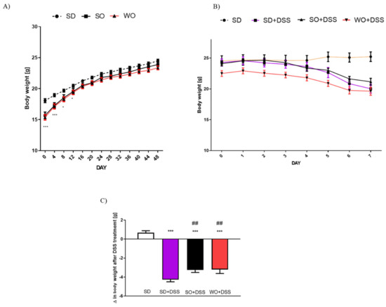 Data for body weight changes (A) in mice fed with standard diet (SD), SD supplemented with sunflower oil (SO), and SD supplemented with walnut oil (WO). Data for body weight loss in the course of dextran sulfate sodium (DSS) treatment (B) and overall change in body weight after 7 days of colitis (C). Data represent mean ± SEM, n = 28 per group (A); n = 8 per group (B,C); * p < 0.05, ** p < 0.01, *** p < 0.001, as compared to SD; ## p < 0.05, as compared to SD + DSS.