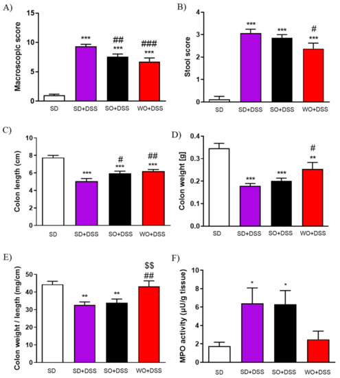 On day 48 of the experiment, the tap water was changed into the 3% DSS solution. After 7 days of colitis, the largest BW loss was observed in SD + DSS group (Figure 2A,B). Treatment with SO and WO significantly reduced BW loss (Figure 2B). On day 7, mice were sacrificed, the macroscopic score was performed, and the tissue for both histological assay and rt-PCR analysis were collected. We found that DSS treatment significantly increased the macroscopic score, stool score, and lowered the colon length and colon weight in all groups (Figure 3A–D). The WO-enriched diet was able to alleviate the effect of DSS, while SO only increased the colon length. Interestingly, the colon weight/length ratio was restored in the WO group completely, as there was no difference compared to the control group (Figure 3E). MPO activity was increased in both SD + DSS and SO + DSS groups comparing to controls, while WO + DSS did not differ significantly from non-inflamed mice (Figure 3F).