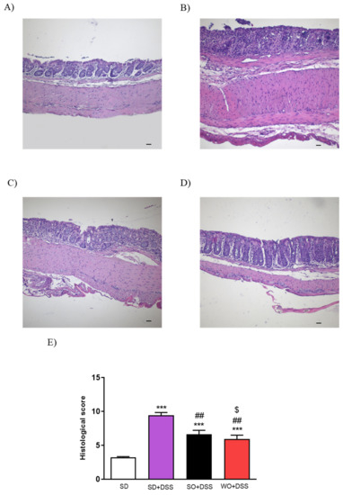 Histological assessment of mouse colon samples supported the macroscopic observations (Figure 4). Analysis revealed intact epithelium, normal muscle architecture, and an absence of edema in the control group (Figure 4A). Microscopic damage, characterized by the loss of mucosal architecture, the presence of crypt abscesses, the thickening of smooth muscle, as well as widespread cellular infiltration was observed in SD + DSS as well as SO + DSS groups (Figure 4B,C). WO prevented colon damage, as examined microscopically (Figure 4D) and in the histological score (Figure 4E).