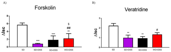 To examine ion flow contingent on the voltage-dependent Na+ channel, we used VER. DSS significantly lowered the ΔIsc in SD + DSS and SO + DSS groups (Figure 5B). WO reversed this effect in inflamed tissue.
