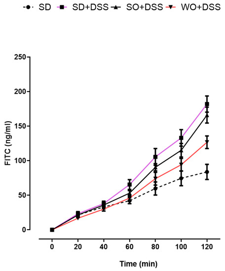 Effect of diet enriched with sunflower oil (SO) and walnut oil (WO) on colon permeability in DSS-treated mice. Data represent mean ± SEM, n = 8 animals per group. SD and SD + DSS groups are significantly different starting from 80 min (80 min, p < 0.001; 100 min, p < 0.001; 120 min, p < 0.001). SD + DSS and WO + DSS groups are significantly different starting from 80 min (80 min, p < 0.05; 100 min, p < 0.01; 120 min, p < 0.001).