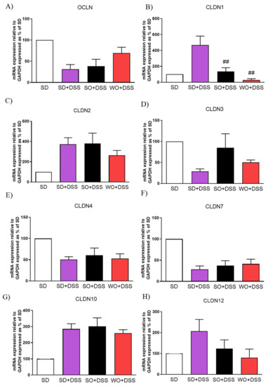 To assess TJs mRNA expression, the real-time PCR was performed using distal colon samples collected from every group (Figure 7). Both SO and WO were able to significantly restore the level of CLDN1 (Figure 7B). We did not observe any changes in CLDN12 in investigated groups (Figure 7H).