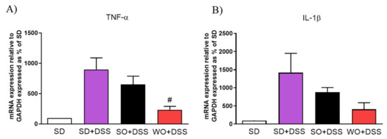 Supplementation with WO significantly inhibited the effect of DSS on tumor necrosis factor α (TNF-α) (Figure 8A) and partially on interleukin 1β (Figure 8B).