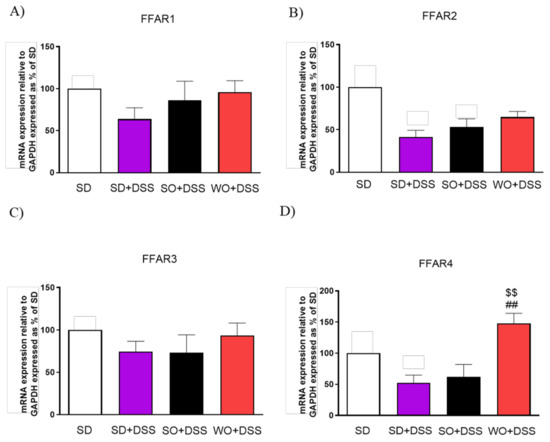 Diet enriched in FAs did not alter FFAR1 and FFAR3 expression (Figure 9A,C). Mice fed with a WO-enriched diet exhibited significantly higher FFAR4 levels than the SD + DSS group (Figure 9D).