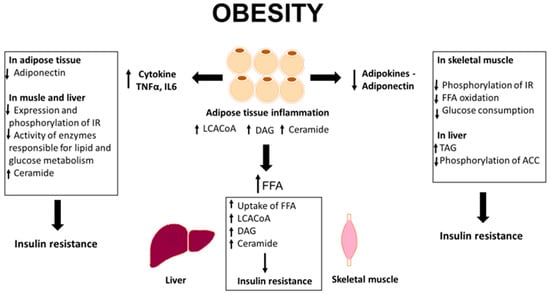 Obesity is defined as an excessive accumulation of adipose tissue in the body, which contributes to overall health impairment. Obesity and the resulting health complications (insulin resistance and type 2 diabetes) are some of the main causes of mortality in developed countries. Although adipose tissue itself does not play a dominant role in insulin-dependent glucose uptake, it seems to have a paramount role in inducing systemic insulin resistance resulting from obesity. The exact mechanism by which adipose tissue induces insulin resistance is unknown; however, numerous studies have shown its significant role in this pathological process.
