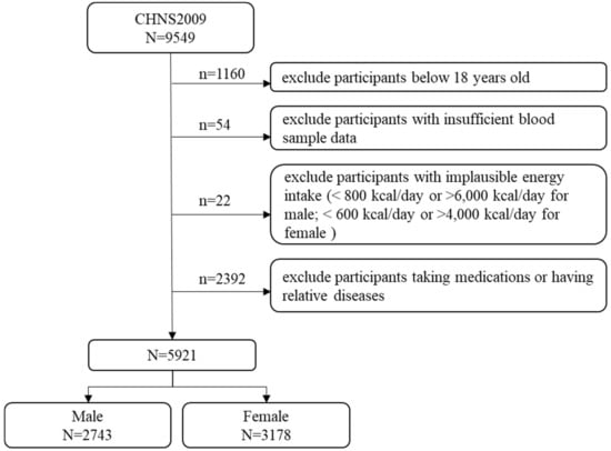 This study used one round of survey data from 2009. Participants aged less than 18 years (n = 1160) were excluded. Subsequently, we excluded 54 participants with insufficient blood sample data (i.e., TC, HDL-C, low-density lipoprotein cholesterol [LDL-C], TG, and fasting plasma glucose levels) and 22 participants with implausible energy intake (<800 kcal/day or >6000 kcal/day for males; <600 kcal/day or >4000 kcal/day for females) []. Additionally, we excluded participants taking medications for hypertension, diabetes, and myocardial infarction and participants who reported a medical history of heart attack, stroke, or diabetes (n = 2392). Finally, a total of 5921 participants (2743 males and 3178 females) were included in this study. A flowchart of the selection process of the study population is shown in Figure 1.