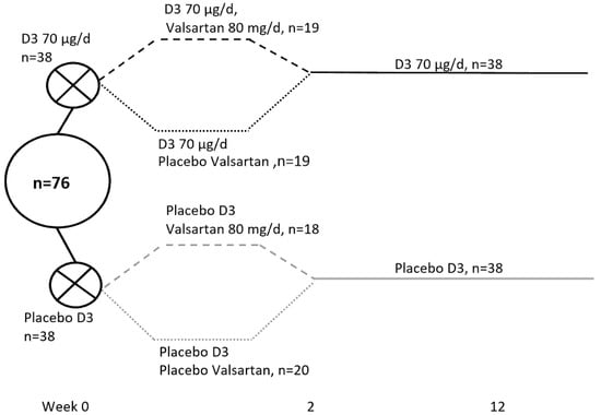 The participants received a daily supplement of 70 µg (2800 IU) of cholecalciferol or a similarly administered placebo for 12 weeks. For the first two weeks, the design was 2 × 2 factorial with an angiotensin II receptor blocker (valsartan, 80 mg per day) or similar placebo in order to study the response of PTH to the treatment in the presence of a blockade of the renin–angiotensin–aldosterone system. These findings have previously been reported, showing no impact of the angiotensin II receptor blocker on PTH levels [15].