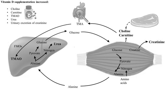 Our findings need to be considered in relation to our clinical findings on cardiovascular and musculoskeletal health [14,16,17]. Overall, there was no effect of vitamin D supplementation on measures of cardiovascular health. Cardiac and/or smooth muscle cells also contain the examined muscle-related metabolites. Thus, we cannot rule out that the metabolites derive from cardiac and/or smooth muscle cells, but in a post hoc analysis no associations were found between the muscle-related metabolites and blood pressure, arterial stiffness, or cardiac conductivity. In contrast, we previously reported a detrimental effect on muscle health and physical performance [16]. Carnitine, choline, TMAO, urea, and creatinine derive from the muscles [29] (Figure 2), and the increase in carnitine, choline, creatinine, and urea correlated negatively with the findings on muscle strength/performance, suggesting that these findings can be ascribed to changes in skeletal muscle.