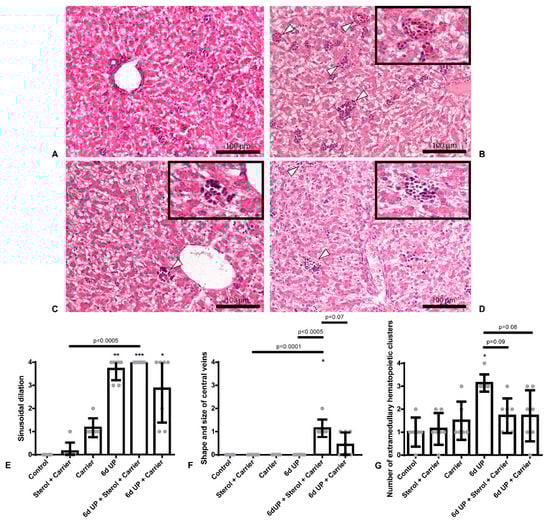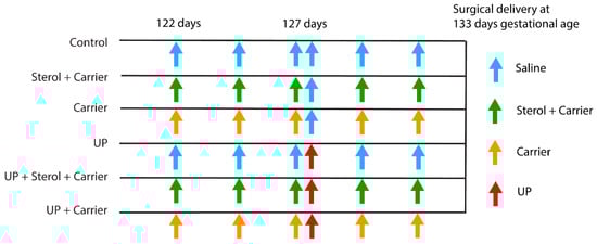 3.1. Sterol + Carrier, as Well as Carrier Alone, Partly Decrease Hepatic Inflammation Due to UP-Induced Chorioamnionitis