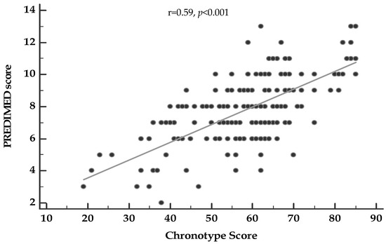 Correlation between chronotype score and PREDIMED score A p-value denotes a significant difference (p < 0.05).