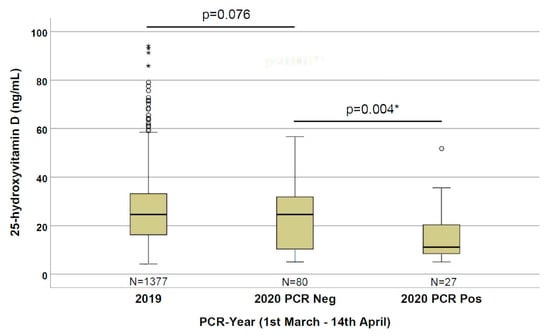 25-hydroxyvitamin D concentrations in the three evaluated groups (patients from 1 March to 14 April of 2019 and 2020 with a negative PCR, and of 2020 with a positive PCR for SARS-CoV-2. *: significant results.