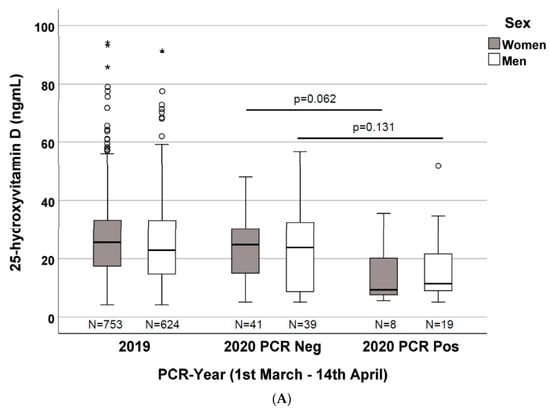 On the other hand, when stratifying the 2020 patients by gender and PCR positivity, the vitamin D concentrations were different, with a clear trend, but were not statistically significant, probably due to the low number in each cluster. In fact, when we consider the 2019 patients, the vitamin D concentrations were significantly different for both the 2020 PCR-positive women (753 vs. 8) and men (624 vs. 19), respectively (Figure 2A).