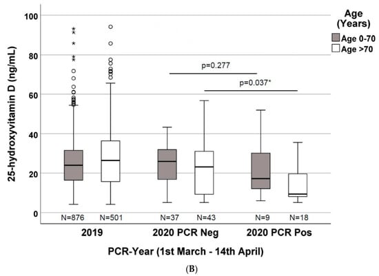 (A) 25-hydroxyvitamin D concentrations in the three evaluated groups divided by gender (patients from 1 March to 14 April of 2019 and 2020 with a negative PCR, and of 2020 with a positive PCR to SARS-CoV-2; (B) 25-hydroxyvitamin D concentrations in the three evaluated groups divided by age (0–70 years vs. >70 years) (patients from 1 March to 14 April of 2019 and 2020 with a negative PCR, and of 2020 with a positive PCR for SARS-CoV-2. *: significant results.