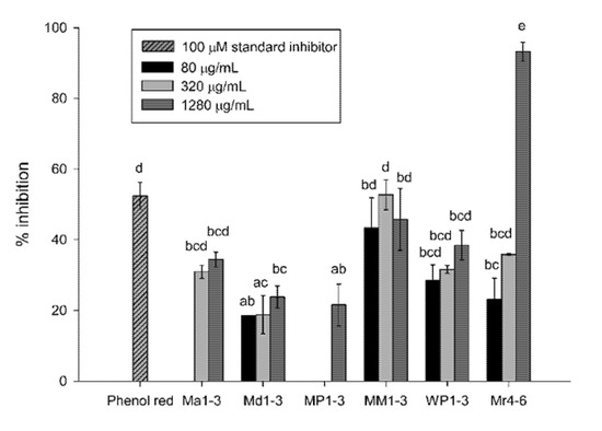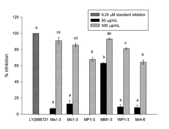 Percentage inhibition of β-secretase (BACE) of Mentha australis (Ma1-3), M. diemenica (Md1-3), M. spicata var. crispa (MM1-3), M. × piperita (MP1-3), M. × piperita var. officinalis (WP1-3) and M. requienii (Mr4-6). Results are presented as mean ± standard error (SE) (n = 3). Different letters indicate a significant difference at p < 0.05. 50 µg/mL MP1-3 resulted in no inhibition.