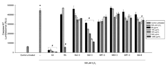 Detection of caspase-3 and -7 activity was performed according to the manufacturer’s instructions (detection of caspase-3 and -7 activities in cell-based assays) using 96-well cell culture plates. When cells reached 80–90% confluency, they were treated with various concentrations (80, 160, 320, 640 and 1280 μg/mL) of mint extracts for 24 h, prior to exposure to 500 μM H2O2 for 90 min to detect their neuroprotective activity. The extracts were aspirated before the addition of H2O2 to prevent direct interaction between mint extracts and H2O2. To detect the potential use of mint extracts as a treatment, cells were treated with the extracts after exposure to 500 μM H2O2 for 90 min. Another group of cells was treated, in the same manner, with ascorbic acid as a reference antioxidant compound or rosmarinic acid as the major antioxidant compound present in mint extracts [16]. The control cells were treated with the same medium without H2O2 or extracts. Luminescence was then detected using a luminometer (Fluostar Omega BMG Labtech, Germany, software version 1.20). The assay was performed in triplicate (n = 3). Results have been presented as relative luminescence units (RLU), with luminescence directly proportional to caspase-3/7 activity.