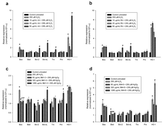 As Md1-3 and Mr4-6 showed potential neuroprotective effect by reducing caspase activity, quantitative real-time PCR was performed on total RNA isolated from pretreated cultured cells to quantify apoptotic and antioxidant gene expression levels. Cells were cultured in 24-well plates in which cells were more sensitive to 500 µM H2O2 than in 96-well plates, therefore, cell damage was induced using 250 µM H2O2. H2O2-treatment induced upregulation of the pro-apoptotic gene, Bax, in SH-SY5Y cells in comparison to untreated cells (Figure 4). Pretreatment of SH-SY5Y cells with the highest concentration of ascorbic acid (80 μg/mL = 450 μM) or rosmarinic acid (80 μg/mL = 220 μM) prior to H2O2 exposure increased the expression of the anti-apoptotic genes Bcl-2 and Bcl-xL more than with H2O2 exposure alone or in untreated cells (p < 0.05), while only 80 μg/mL of ascorbic acid increased the expression of the antioxidant genes Trx and HO-1.