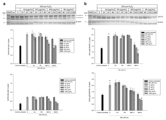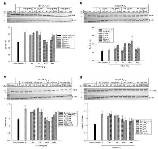 Western blot analysis was used to further investigate the effect of Md1-3 and Mr4-6 extracts, rosmarinic acid and ascorbic acid on protein expression and signalling pathways of apoptosis. Their effects on the expression of the proteins Bax and Bcl-xL was similar to those induced on mRNA expression (Figure 5 and Figure S4). Cell damage induced by H2O2 increased the expression levels of both ASK1 and Erk1/2 significantly, while there was apparently a numeric but non-significant increase in expression of p38 MAPK, SAPK/JNK and P-Erk1/2 (Figure 5 and Figure 6 and Figure S5). Md1-3 at 320 and 1280 μg/mL significantly decreased the expression level of ASK1, while only 320 and 1280 μg/mL Mr4-6 significantly decreased the expression level of SAPK/JNK and Erk1/2, respectively. However, an apparent numeric but non-significant decrease in the expression levels of p38 MAPK, Erk1/2 and P-Erk1/2 was observed upon pretreating the cells with the other concentrations of Md1-3 or Mr4-6.