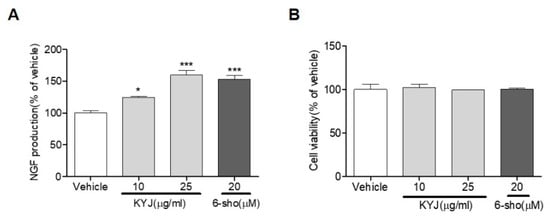 We investigated whether KYJ induced NGF production. We found that KYJ (124.36 ± 1.95% at 10 µg/ml; 159.56 ± 7.14% at 25 µg/mL) significantly increased NGF production in C6 glioma cells, which are representative cells of astrocytes (Figure 1A). We further found that KYJ showed no cytotoxicity in C6 glioma cells (Figure 1B). A potent NGF stimulator, 6-shogaol, was used as the positive control [26].