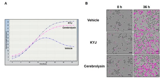 To measure the effect of KYJ on neurite outgrowth, N2a cells were used according to previously reported methods [18,20]. The N2a cells were seeded onto 6 well plates at a density of 1 × 104 cells/well and treated with the KYJ extract for 24 h. These cells ceased to proliferate and began to differentiate, as evidenced by neurite outgrowth, in response to serum starvation, cerebrolysin, or growth factors such as neurotrophins and glial-cell-derived neurotrophic factor family ligands. Neurite lengths of N2a cells were measured using an IncuCyte imaging system (Essen Instruments, Ann Arbor, MI, USA).
