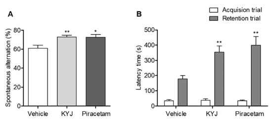To investigate whether KYJ enhanced memory function, we conducted two behavioral tests after administration. First, spatial memory performance was assessed by the spontaneous alternation (%) in the Y-maze test. The KYJ-treated group (72.88 ± 1.99%; **p < 0.01) showed a significant increase in spontaneous alternation compared to the vehicle-treated group (61.07 ± 3.28%). Additionally, the piracetam-treated group showed significant elevation of spontaneous alternation (72.56 ± 3.04%; *p < 0.05 vs. vehicle-treated group; Figure 3A).