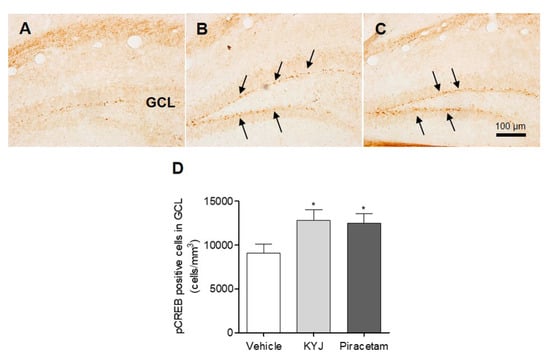 KYJ stimulated the phosphorylation of hippocampal CREB in mice. (A–C) Representative images of each group are shown: (A) vehicle-treated group, (B) KYJ 200 mg/kg/day (per os; p.o.) group, (C) piracetam 200 mg/kg/day (Intraperitoneal injection; i.p.) group. (D) The number of pCREB-positive cells (black arrow) in the GCL region was quantified via stereological counting. *p < 0.05 vs. the vehicle-treated group.