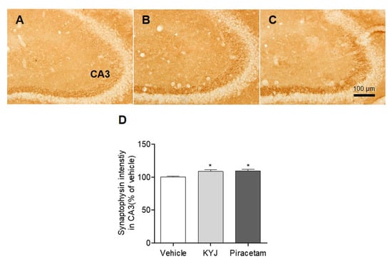 Synaptophysin, a potential marker for synaptic vesicles in the integration and connectivity between synaptic terminals, is involved in regulating synapse formation in hippocampal neurons, leading to memory consolidation [29,30]. We explored whether KYJ modulates the synapse formation in the mouse hippocampus by measuring the optical density of synaptophysin-positive CA3 regions. The percentage of synaptophysin-positive intensity in CA3 was significantly higher in both the piracetam- (109.33 ± 2.31%; *p < 0.05) and KYJ-treated groups (108.53 ± 2.92%; *p < 0.05) than in the vehicle-treated group (Figure 5). These results suggest that KYJ treatment could induce the strengthening of hippocampal synapse formation that contributes to memory enhancement.