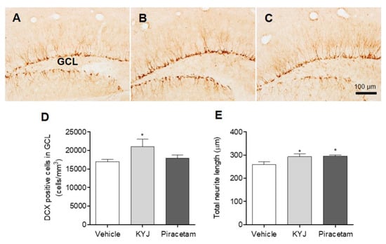 KYJ promoted hippocampal cell differentiation and neurite extension in mice. (A–C) Representative images are shown: (A) vehicle-treated group, (B) KYJ 200 mg/kg/day p.o. group, (C) piracetam 200 mg/kg/day i.p. group. (D) The number of DCX-positive cells in the GCL region was quantified via stereological counting. (E) The total neurite length was the sum of DCX-positive cell’s neurite length. *p < 0.05 vs. the vehicle-treated group.