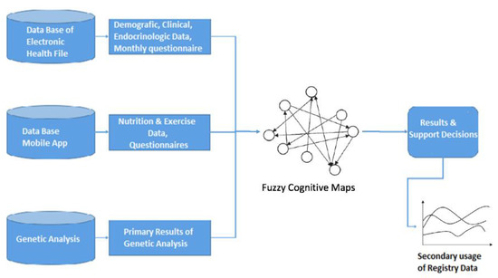 The main innovative actions of this application include: (a) collection and analysis of clinical, hematological, biochemical, endocrinologic and genetic data of overweight and obese children and adolescents followed up at our Out-patient Clinic for the Prevention and Management of Overweight and Obesity in Childhood and Adolescence; (b) detection of polymorphisms associated with obesity, diabetes mellitus type 2 and antioxidant capacity; (c) development of a specific obesity-risk algorithm by linking each genotype to the patient’s data, as well as published information on how it affects body weight at clinical or genetic level; and (d) development of interconnected online and mobile applications to integrate the ecosystem of applications for childhood obesity. Applications include the development and expansion of the EMRF of the “National Registry for the Prevention and Management of Overweight and Obesity in Childhood and Adolescence”, patient access subsystem and online support, as well as mobile application for children, adolescents and their parents; and finally (e) the development of an intelligent data management platform (in full interoperability with the “National Registry for the Prevention and Management of Overweight and Obesity in Childhood and Adolescence”) using the innovative methodology of fuzzy cognitive maps and modeling techniques from medical data analysis in order to provide personalized management guidelines (Figure 1).