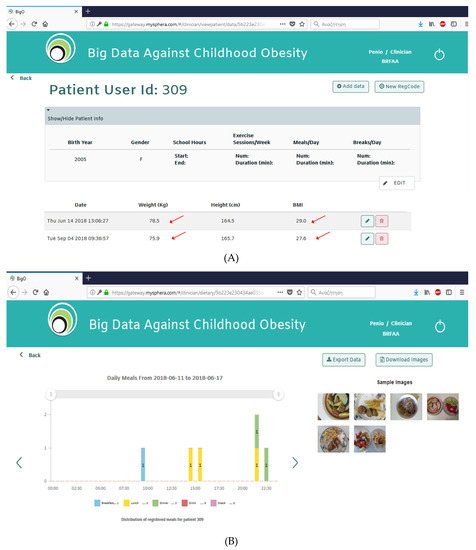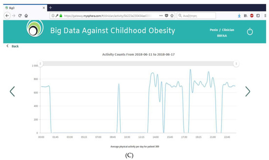 The Big Data against Childhood Obesity Platform: (A) decrease in weight and body mass index (BMI); (B) photographs of foods consumed; (C) the average physical activity per day per week.