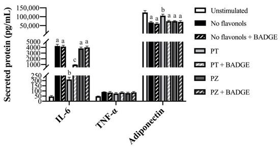 Secreted protein levels of inflammatory (interleukin (IL)-6 and tumor necrosis factor (TNF)-α) and anti-inflammatory (adiponectin) adipokines in lipopolysaccharide (LPS) + cobalt chloride (CoCl2)-stimulated adipocytes co-treated with phloretin (PT) or phlorizin (PZ), with or without bisphenol A diglycidyl ether (BADGE). Values are means ± standard error of the mean (SEM); n = 9/treatment. Data were analyzed by two-way ANOVA and means without a common letter differ within cultures treated ± BADGE, p < 0.05.