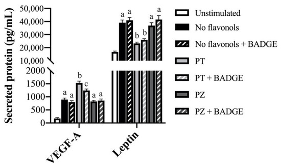 Secreted protein levels of angiogenic factors (vascular endothelial growth factor (VEGF)-A and leptin) in LPS + CoCl2-stimulated adipocytes co-treated with PT or PZ, with or without BADGE. Values are means ± SEM; n = 9/treatment. Data were analyzed by two-way ANOVA and means without a common letter differ within cultures treated ± BADGE, p < 0.05.