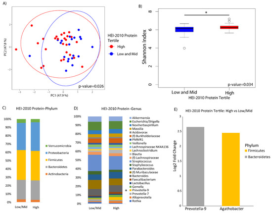 Duodenal microbiome of cirrhotic patients varies by dietary protein. (A) Principal coordinate analysis plot of the microbiome colored by high versus mid and low tertiles of protein adequacy according to the Healthy Eating Index-2010 (HEI-2010) and encircled by 99% confidence interval ellipses. (B) Box plot of microbial diversity by Shannon index (a metric of richness and evenness) grouped by protein adequacy. (C,D) Taxonomic summary plots showing the relative abundance of all (C) phyla and (D) genera (minimum of 1% relative abundance) by protein adequacy. * Represents genera that are differentially abundant (E) Log2 fold changes are shown for genera with differential abundance between high versus low protein adequacy in DESeq2 models at q < 0.05.