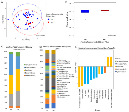 Duodenal microbiome of cirrhotic patients varies by dietary fiber. (A) Principal coordinate analysis plot of the microbiome colored by fiber intake based on USDA recommendation of 14 g/kcal encircled by 99% confidence interval ellipses. (B) Box plot of microbial diversity by Shannon index (a metric of richness and evenness) grouped by fiber intake. (C,D) Taxonomic summary plots showing the relative abundance of all (C) phyla and (D) genera (minimum of 1% relative abundance) by fiber intake. *Represents genera or phyla that are differentially abundant. (E) Log2 fold changes are shown for genera with differential abundance between those that met daily dietary fiber intake recommendations versus those that did not in DESeq2 models at q < 0.05.