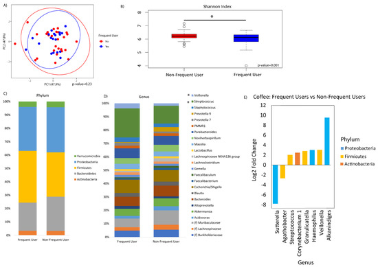 Duodenal microbiome of cirrhotic patients varies by frequency of coffee drinking. (A) Principal coordinate analysis plot of the microbiome colored by frequent (≥5 cups/week) versus non-frequent (<5 cups/week) coffee drinking, and encircled by 99% confidence interval ellipses. (B) Box plot of microbial diversity by Shannon Index (a metric of richness and evenness) grouped by coffee frequency. (C,D) Taxonomic summary plots showing the relative abundance of all (C) phyla and (D) genera (minimum of 1% relative abundance) by frequency of coffee use. (E) Log2 fold changes are shown for genera with differential abundance between frequent users versus non-frequent users in DESeq2 models at q < 0.05.