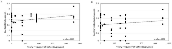 Linear regression of the number of cups of coffee consumed per year by (A) Veillonella and (B) Corynebacterium 1 relative abundance in the duodenum.