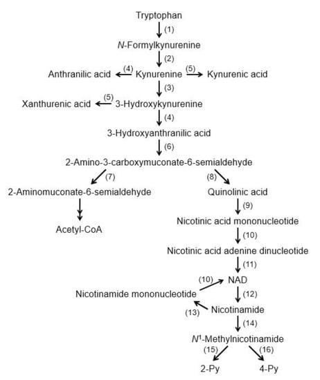 Figure 1. Tryptophan degradation pathway. (1) Tryptophan 2,3-dioxygenase/Indoleamine 2,3-dioxygenase (2) formamidase, (3) kynurenine 3-monoxygenase, (4) kynureninase, (5) kynurenine aminotransferase, (6) 3-hydroxyanthranilic acid oxygenase, (7) 2-amino-3-carboxymuconate-6-semialdehyde decarboxylase, (8) nonenzymatic reaction, (9) quinolinate phosphoribosyltransferase, (10) nicotinic acid (nicotinamide) mononucleotide adenylyltransferase, (11) NAD+ synthetase, (12) NAD+ degrading enzyme, (13) nicotinamide phosphoribosyltransferase, (14) nicotinamide methyltransferase, (15) 2-Py-forming N1-methylnicotinamide oxidase, and (16) 4-Py-forming N1-methylnicotinamide oxidase. Abbreviations: NAD+: nicotinamide adenine dinucleotide; 2 Py: N1-methyl-2-pyridone-5-carboxamide; and 4 Py: N1-methyl-4-pyridone-3-carboxamide.