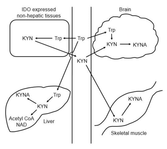 Figure 4. Schematic representation of the organ–organ interaction for tryptophan and kynurenine metabolism. Abbreviations: IDO: indoleamine 2,3-dioxygenase; KYN: kynurenine; KYNA: kynurenic acid; Trp: tryptophan.