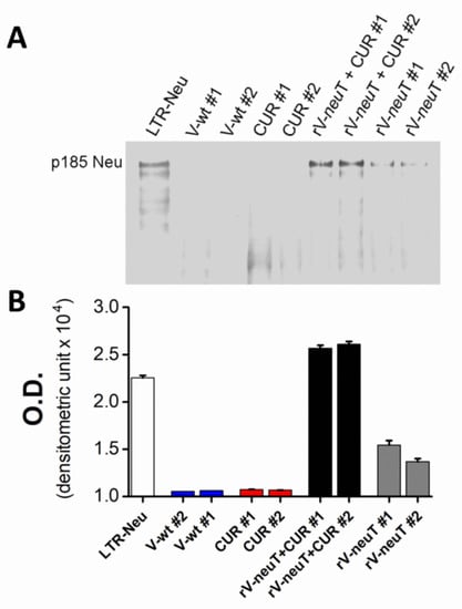 Serum antibody response of mice upon treatments with V-wt, Curcumin (CUR), rV-neuT, or rV-neuT+CUR. (A) Induction of serum antibodies specific for Neu following treatments was detected by immunoprecipitation following Western blotting. Sera from three to four mice for each group were pooled (Group #1, Group #2) and used to immunoprecipitate LTR-Neu cell lysate. Neu specificity was visualized by Western blotting analysis using a specific anti-Neu polyclonal antibody (80 μg LTR-Neu cell lysate was loaded for Western blotting analysis). (B) The intensities of the bands obtained were quantified using ImageJ software after blot scanning.