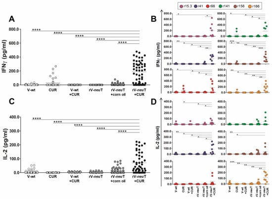 Neu peptides stimulation induced higher IFN-γ and IL-2 release by T cells from rV-neuT+CUR-treated mice than in those from rV-neuT- or CUR-treated mice (Figure 3A,C). The IFN-γ release by T cells from rV-neuT+CUR-treated mice was significantly higher than the release by T cells from rV-neuT-, rV-neuT+corn oil-, or CUR-treated mice when stimulated with all peptides, and particularly with the r156 peptide (Figure 3B). Conversely, IL-2 released by T cells from mice treated with rV-neuT+CUR was significantly higher than the release by T cells from rV-neuT-, rV-neuT+corn oil-, or CUR-treated mice when stimulated only with the r41 and r166 peptides (Figure 3D). Very low or undetectable cytokine release was obtained after Neu peptide stimulation by T cells from mice immunized with CUR, V-wt, or the combination of these two.