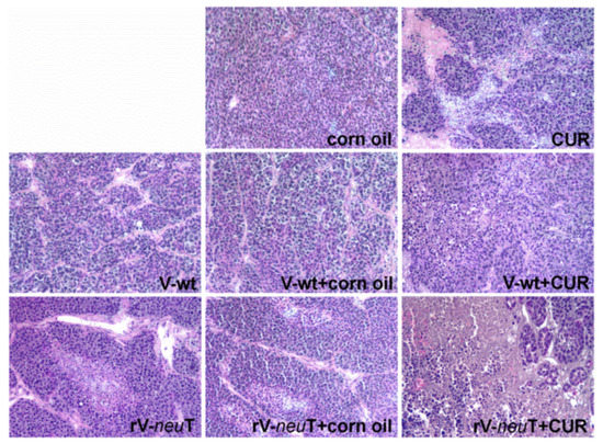 Histology of tumors from mice treated with V-wt, Curcumin (CUR), rV-neuT, or the combination. Tumors from three different animals for each group were stained using hematoxylin and eosin. Original magnification 100×.