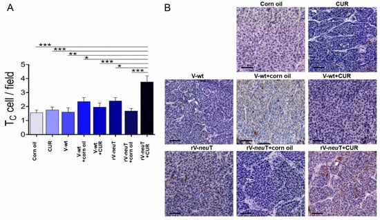 Immunohistochemical (IHC) analysis was performed to detect the presence of tumor-infiltrating leukocytes (TILs) in tumors from BALB-neuT-treated mice. Samples were evaluated on digital images by counting the number of positive cells in 10 high-power fields (HPFs) (40×). Necrotic areas were excluded from the analysis. Tumor tissue analysis showed an important infiltration of T-helper lymphocytes (TH, CD4+) (Figure 5). Post-hoc analysis (Tukey’s test) showed a significant increase in the TH cells within the tumor in rV-neuT+CUR-treated (4.0 ± 2.2) mice as compared to rV-neuT+corn oil- (2.4 ± 1.5; p < 0.01), rV-neuT- (2.1 ± 1.3; p < 0.001), V-wt+CUR- (2.3 ± 1.5; p < 0.05), V-wt+corn oil- (2.1 ± 1.3; p < 0.01), and corn oil-treated (2.0 ± 1.3; p < 0.001) mice (Figure 5A). TH cells were homogeneously distributed in the tumors of rV-neuT+CUR treated mice (Figure 5B). A considerable infiltration of T-cytotoxic lymphocytes (TC, CD8+) was observed in mice treated with rV-neuT+CUR (Figure 6). A post-hoc test showed a significant increase in the number of Tc cells within the tumor in rV-neuT+CUR-treated (3.8 ± 2.0) mice as compared to mice receiving other treatments: rV-neuT+corn oil (1.7 ± 1.2; p < 0.001), rV-neuT (2.4 ± 1.3; p < 0.05), V-wt+CUR (2.0 ± 1.3; p < 0.001), V-wt+corn oil (2.4 ± 1.3; p < 0.05), V-wt (1.6 ± 1.0; p < 0.01), CUR (1.8 ± 1.4; p < 0.001), or corn oil (1.6 ± 1.2; p < 0.001) (Figure 6A). Notably, clusters of TC cells, rather than homogeneously dispersed cells, were observed within the tumors from rV-neuT+CUR-treated mice (Figure 6B). Tumors from all groups of treated mice showed the presence of both B-cell lineage (CD19+, Supplementary Figure S1) and macrophages (Mf, F4/80+, Supplementary Figure S2). However, no significant differences were detected among different groups. Neutrophil infiltration was observed in tumors from mice treated with rV-neuT+CUR (Supplementary Figure S3). There was not any difference between the number of tumor neutrophils in rV-neuT+CUR-treated (2.8 ± 0.8) mice as compared to that in CUR- (1.7 ± 1.1), rV-neuT- (1.9 ± 1.0) or rV-neuT+corn oil-treated (1.8 ± 0.6) mice (Supplementary Figure S3).