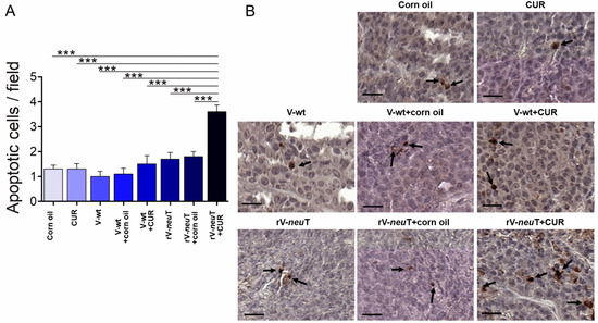 The presence of apoptotic cells was evaluated by cleaved caspase-3 IHC analysis (Figure 7). The number of apoptotic cells within the tumors from rV-neuT+CUR-treated (3.6 ± 0.8) mice was higher than that from rV-neuT+corn oil- (1.8 ± 0.6, p < 0.001), rV-neuT- (1.7 ± 0.8, p < 0.001), V-wt+CUR- (1.5 ± 1.1; p < 0.001), V-wt+corn oil- (1.1 ± 0.7; p < 0.001), V-wt- (1.0 ± 0.7; p < 0.001), CUR- (1.3 ± 0.7, p < 0.001), and corn oil-treated (1.3 ± 0.5; p < 0.001) mice.