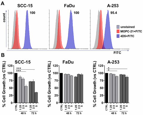 In order to evaluate whether the treatment with mAb 4D5 was able to inhibit the growth of HNC cells, SCC-15, FaDu, and A-253 cells were seeded in serum-free culture medium containing 0.2% BSA and incubated with mAb 4D5 at different concentrations (1.25, 2.5, and 5 μg/mL) for 48 and 72 h. The antibody MOPC-21 (5 μg/mL) was used as a control.