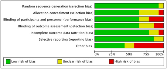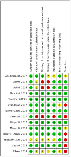 All studies reported the randomization technique that was followed. One study [53] reported allocation methods that imply blinding of personnel could have been broken, so this was considered as of high risk of bias in allocation concealment. Studies that provided insufficient information about allocation methods were considered asexhibiting unclear risk of bias [44,45,54,55]. Two single- blinded studies [44,45] were reported as being of high risk, and other studies [53,54,55] were characterized as demonstrating unclear risk as their blinding method was not mentioned, although reported as double-blinded. In relation to blinding of outcome assessment, five studies [53,54,55,57] were alsocharacterized as having an unclear risk because they were mentioned as double-blind but did not provide sufficient details on the method and two [44,45] were judged as exhibiting a high risk because they were single-blinded. All others were assessed as low-risk studies providing adequate evidence. Two studies [54,57] were considered of unclear risk because they did not address what missing data they had, and one [53] was of high risk due to high percentage of dropout (20%) that may have influenced their results. Except for one [55], all studies prespecified their primary and secondary endpoints with trial registration, so their judgement for selective reporting was considered low risk. Other biases were considered, such as not reporting assessment of diet and physical activity, if the company that produced the product was funding the trial or if there were any methodological issues that were not included in the mentioned bias. Figure 2 shows the risk of bias assessment across all included studies and Figure 3 shows the risk of bias summary, including assessment of each risk item of all included studies.