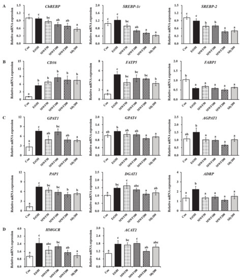 Effects of MWF on the hepatic lipogenesis-related gene levels in chronic alcohol-fed rats. (A) Lipid synthesis transcription factors; (B) fatty acid uptake and transport-related genes; (C) triglyceride synthesis-related genes; (D) cholesterol synthesis and esterification-related genes. Mean ± SE. Statistical significance was determined by one-way ANOVA, followed by Duncan’s multiple range test. Values not sharing a common letter (a, b, c) above the bars are significantly different among the groups at p < 0.05.