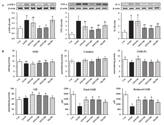 The p-IκB-α protein expression of the EtOH group in the liver was higher than in the Con group, but it was decreased significantly in both MWF100 and MWF200 groups compared to the EtOH group (Figure 3A). The sily200 group did not affect p-IκB-α protein expression in the liver. The hepatic protein expression of TNF-α and IL-6 was increased remarkably by chronic alcohol consumption, but TNF-α was suppressed significantly in the MWF100 and MWF200 groups and IL-6 was reduced slightly compared to the EtOH group (Figure 3A). Serum TNF-α level was increased remarkably in the EtOH group compared to the Con group (Table 2). All doses of MWF decreased significantly in the serum TNF-α level compared to the EtOH group, and they slightly lowered serum IL-6 level without statistical significance.
