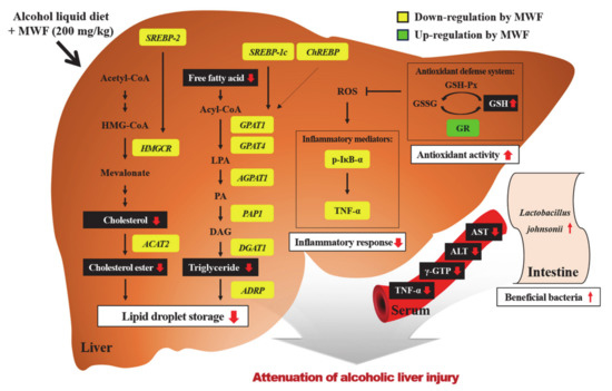 Proposed mechanisms for protective effects of MWF on chronic alcohol-induced liver injury. MWF decreased gene expression involved in de novo TG and cholesterol synthesis, which may contribute to anti-steatotic effects. Moreover, MWF reduced alcohol-induced inflammatory response by inhibiting the NF-κB pathway. MWF positively reacts with the hepatic antioxidant defense system as well as protectively alters alcohol-induced intestinal microflora changes.