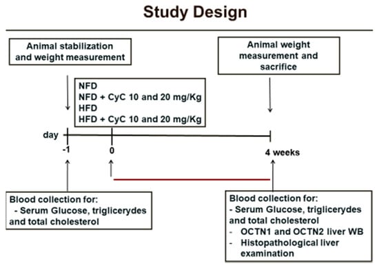It is known that errors in nuclear receptor signaling, including peroxisome proliferator-activated receptor alpha (PPARα), are involved in the pathogenesis of fatty liver disease [25,55]. Furthermore, it has been shown that PPARα upregulates OCTN transporter subfamily expression, an effect driven by natural active ingredients as the ones found in CyC [56]. Thus, it is likely that CyC, via activation of PPARα, counteracts the effect of HFDs in OCTN transporter expression and carnitine availability, thereby contributing in hepato-protective activity of CyC.