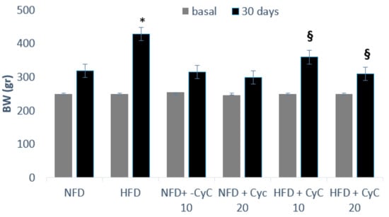 Serum glucose, total cholesterol, triglyceride, SteatoTest and MDA levels at baseline were similar in all four groups of rats used throughout the study. In rats fed an HFD over a period of four consecutive weeks, an increase of serum glucose, total cholesterol, triglyceride levels, SteatoTest, and MDA was found compared to rats receiving standard diet (NFD) (Table 1). This effect was counteracted dose-dependently by supplementation of rats with CyC. In particular, in animals fed a HFD and supplemented with 10 mg/kg of CyC in a single daily administration via gastric gavage, serum glucose, total cholesterol, triglyceride, SteatoTest and MDA levels were significantly lower than the concentrations found in rats receiving only HFDs. Moreover, a further increase of hypoglycemic and anti-lipemic effect of CyC was seen when a dose of 20 mg/kg was used (Table 1). No effect was found in rats receiving a standard diet (NFD) and supplementation with CyC10 and 20 mg/kg. The effect of CyC on serum glucose, triglycerides, cholesterol, SteatoTest and MDA found in rats fed a HFD was associated with a significant reduction in body weight. In fact, feeding rats over a four weeks period with HFD produced a significant body weight increase (Figure 2). This effect was counteracted significantly by oral supplementation of animals with CyC 10 and 20 mg, dose-dependently (Figure 2).